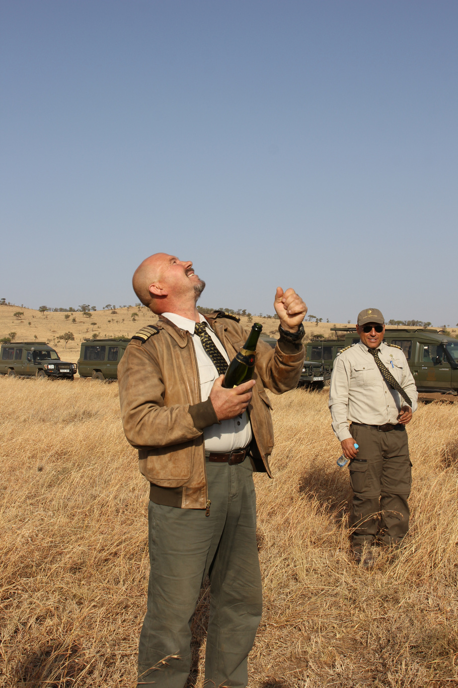 After you reach the final destination, you are picked up in a safari vehicle and transported to the area where you will have breakfast/brunch ready. The food was terrific, and we even got champagne. Here is another remarkable experience: eating out in the bush in the Serengeti plains. At this spot, if you had to use the bathroom, they had an open canvas bathroom facing out into the wild. While that is not the point, just eating breakfast out in the bush with the wildlife around you, lucky no dangerous animals were around. I know we had a herd of water buffalo and zebra around. We even had an ostrich in the area.